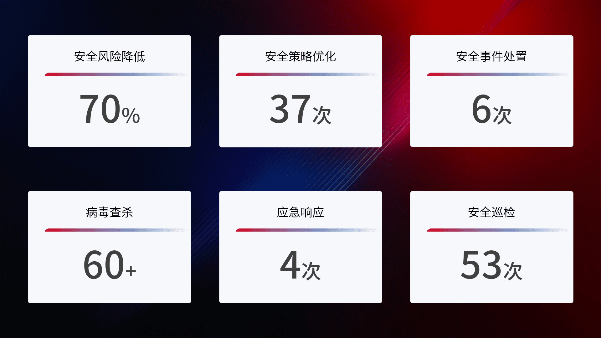 提供全面的安全事件报告体系,,包括处置报告、、、周报、、、季度和年度总结,,,结合持续监控,,,,帮助客户深入了解网络安全状况。。。