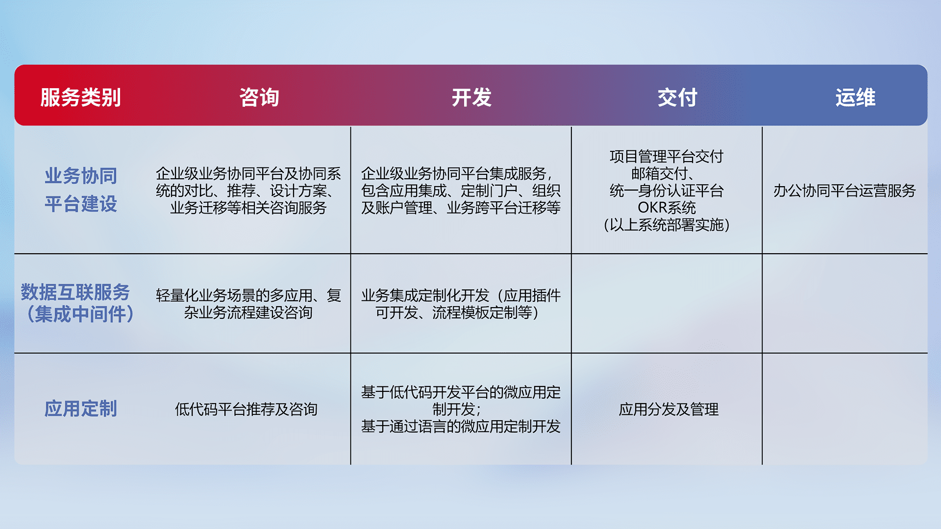 针对钉钉、、企微、、IDaas等平台级产品提供产品的规划、、、、方案、、、交付、、、定制化开发等服务,,,,实现如统一协同办公、、、智能客户服务、、混合会议管理、、智能数据查询、、、等业务场景,,,实现数字化转型。。