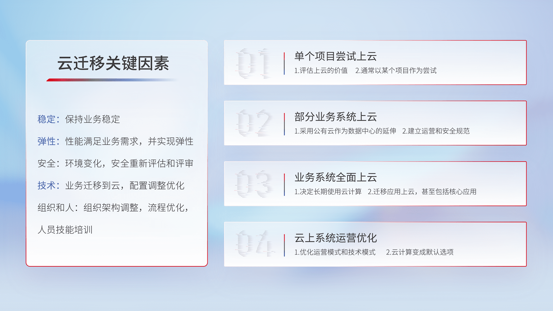 结合实际业务,,,从规划设计、、、、云平台选型、、、云原生改造、、数据迁移、、、、集成交付,,,迁移全过程为客户识别最佳上云路径,,,做好风险识别管理,,,设计网络架构、、、、身份权限、、、安全审计合规、、、操作审计、、日志审计、、、监控告警策略、、、多站点容灾设计等,,,,对云上基础设施进行整体规划,,,提升IT治理水平,,,以满足弹性、、、、高可用、、、高性能的需求。。。