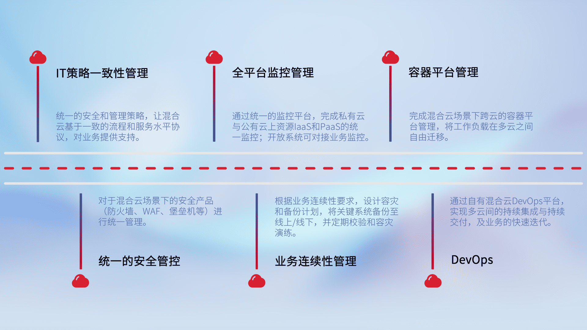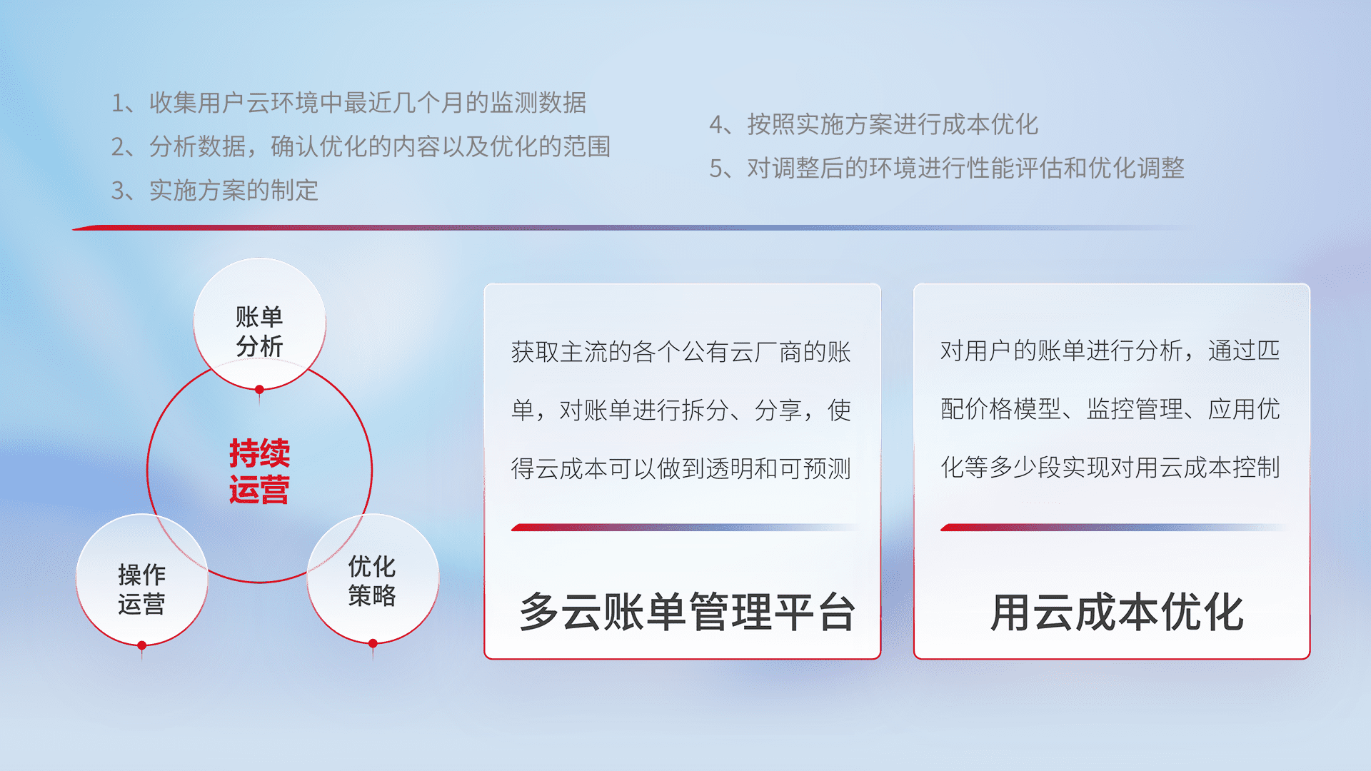 通过多云纳管,,以统一的资源数据模型把客户的云资源进行抽象和封装,,进而实现对多云资源的统一操作,,,,保障云资源管理的可靠性、、、稳定性与可用性。。。量身定制化运维内容,,配置、、、、开发运维、、、补丁管理、、、备份、、监控、、、、认证和访问管理、、审计和日常巡检等,,,,保障在用云过程中的可靠度,,稳定度以及高可用率。。