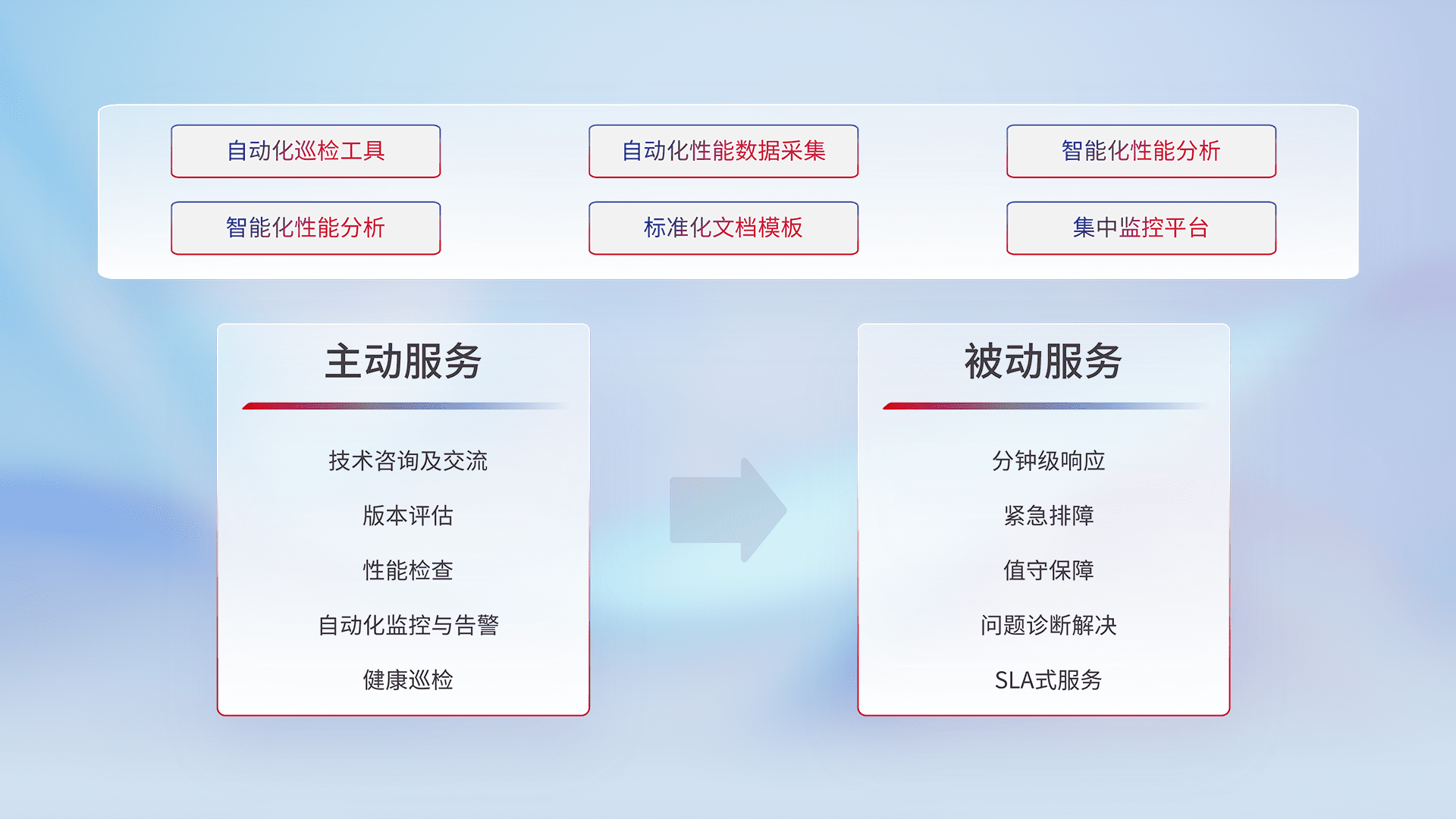 智能化工具和标准化文档,,,保障服务质量,,,,提供主动服务(包含技术咨询、、、、版本评估、、、性能检查、、、、自动化监控与告警、、健康巡检)和被动服务包含(分钟级响应、、紧急排障、、、值守保障、、、、问题诊断解决、、、、SLA服务)。。